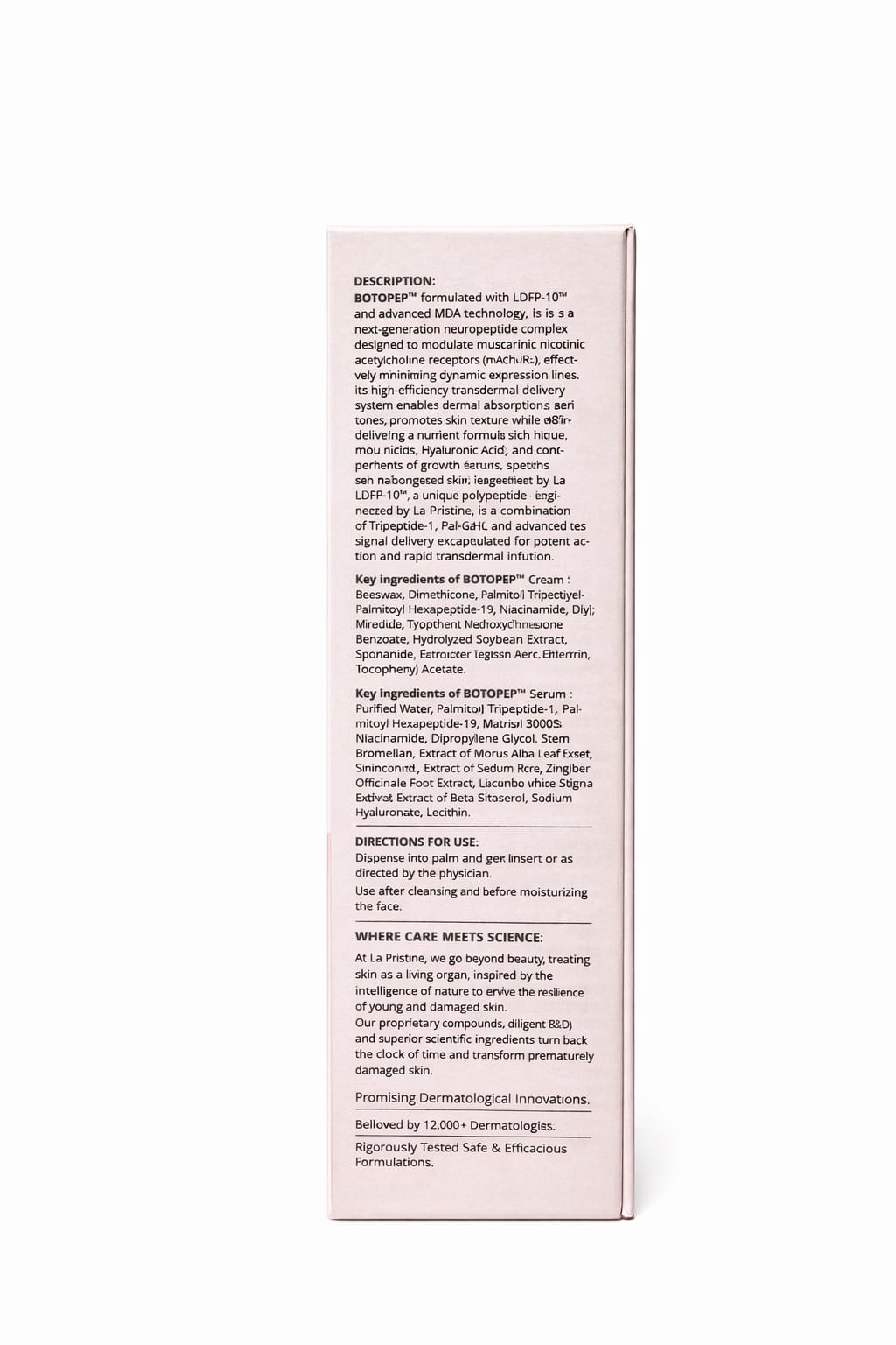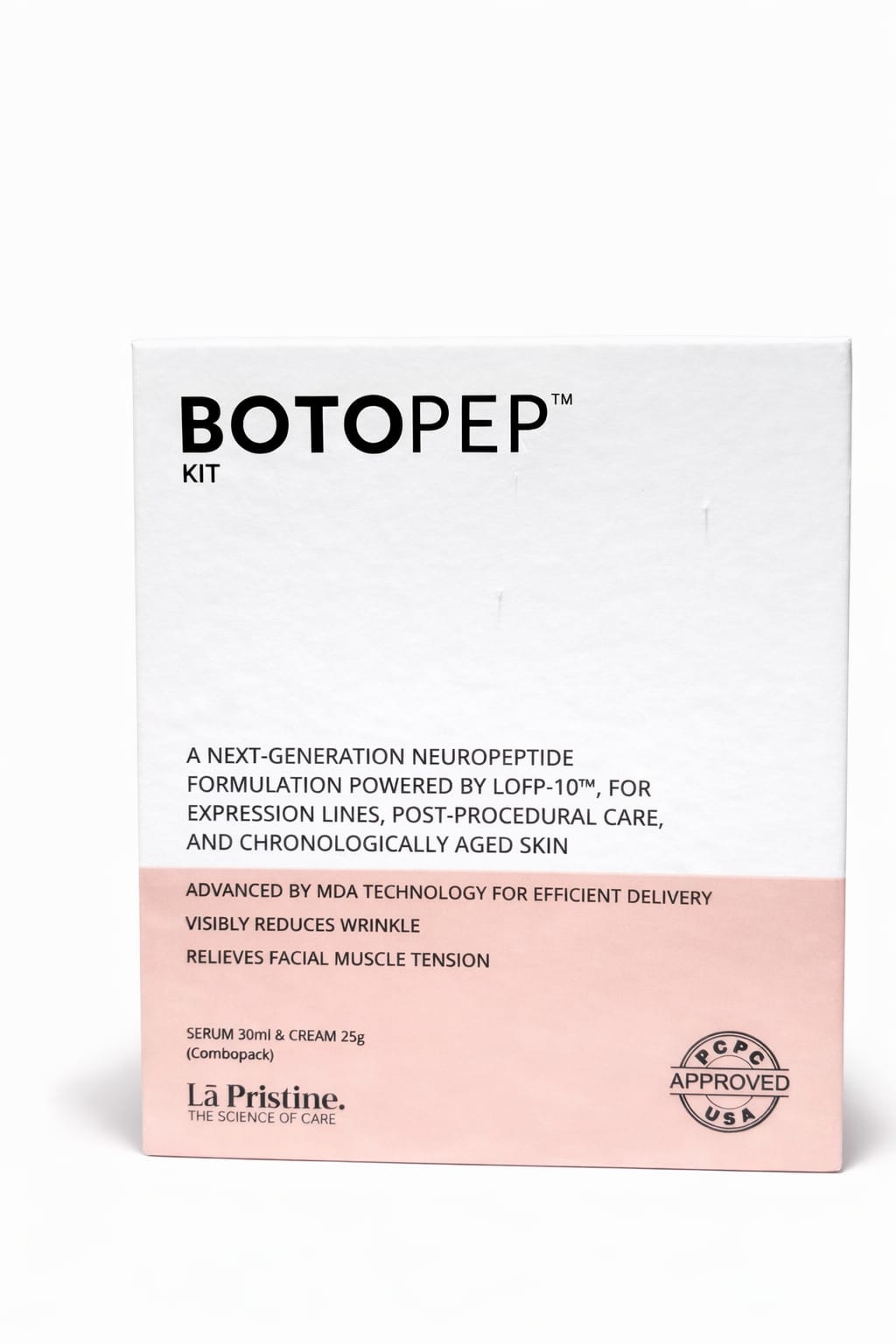 The BOTOPEP™ Kit is a next-generation anti-aging system comprising a Serum (30 ml) and a Cream (25 g) . Formulated with advanced MDA technology for efficient delivery, it uses a unique neuropeptide complex to target the underlying causes of skin aging. The formula is designed to modulate muscarinic nicotinic acetylcholine receptors to minimize dynamic expression lines and transform prematurely damaged skin.