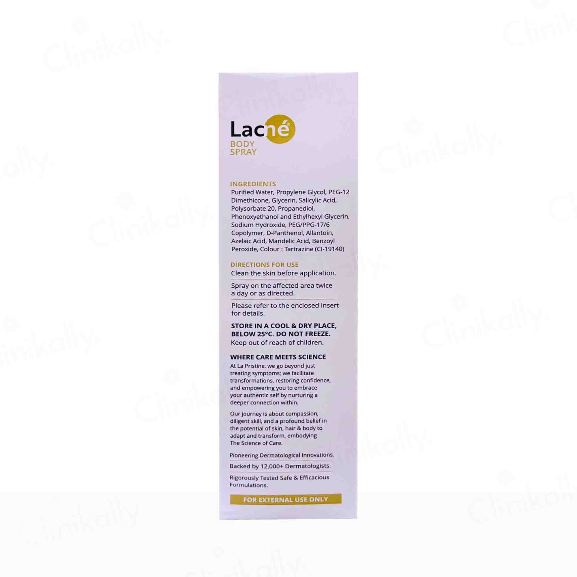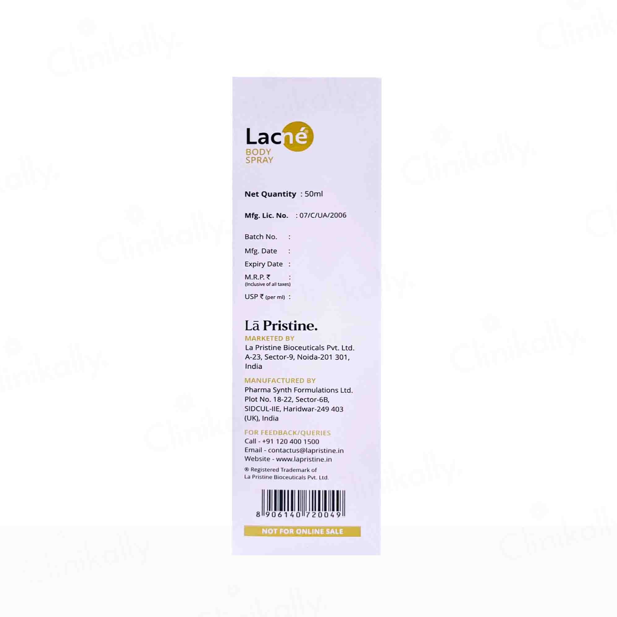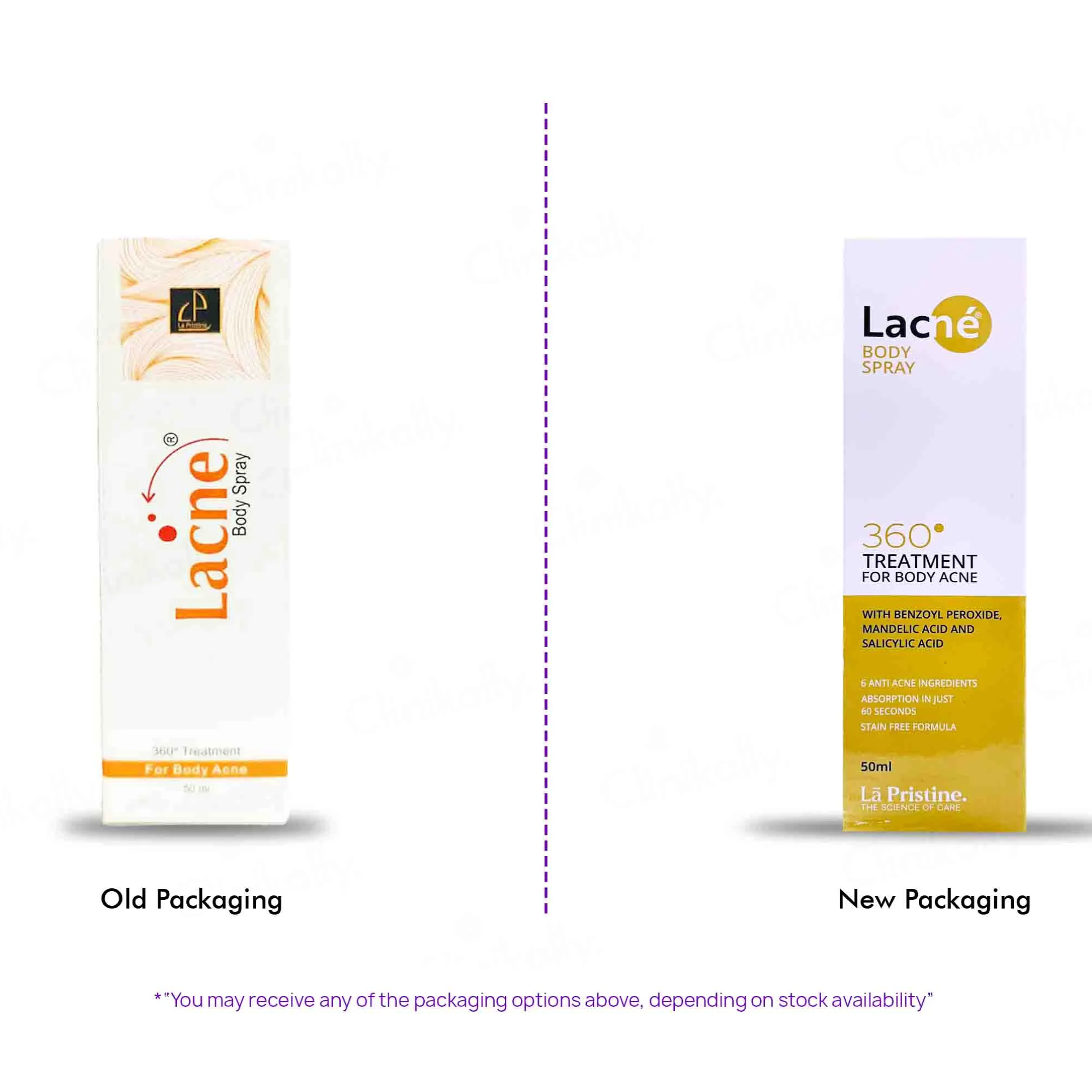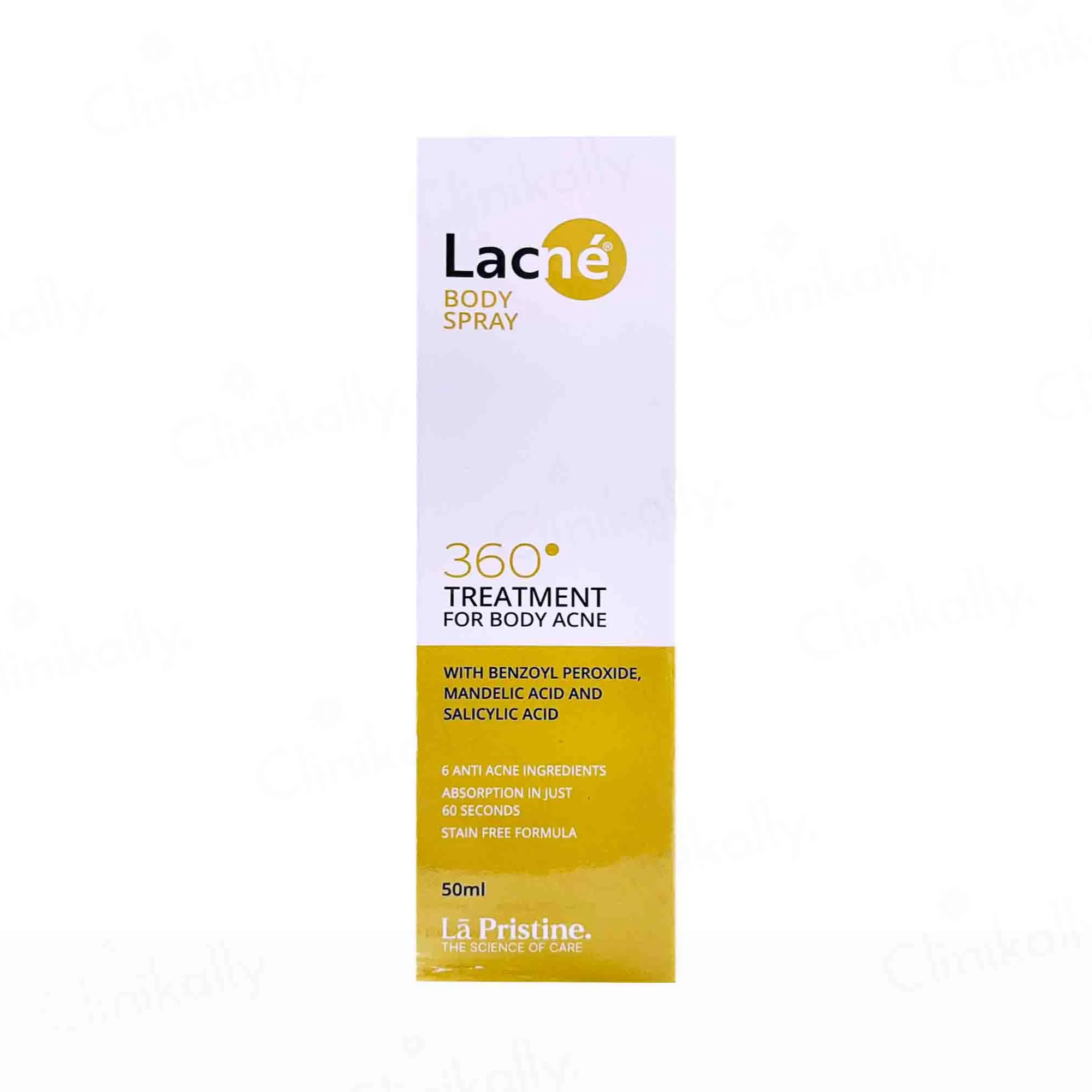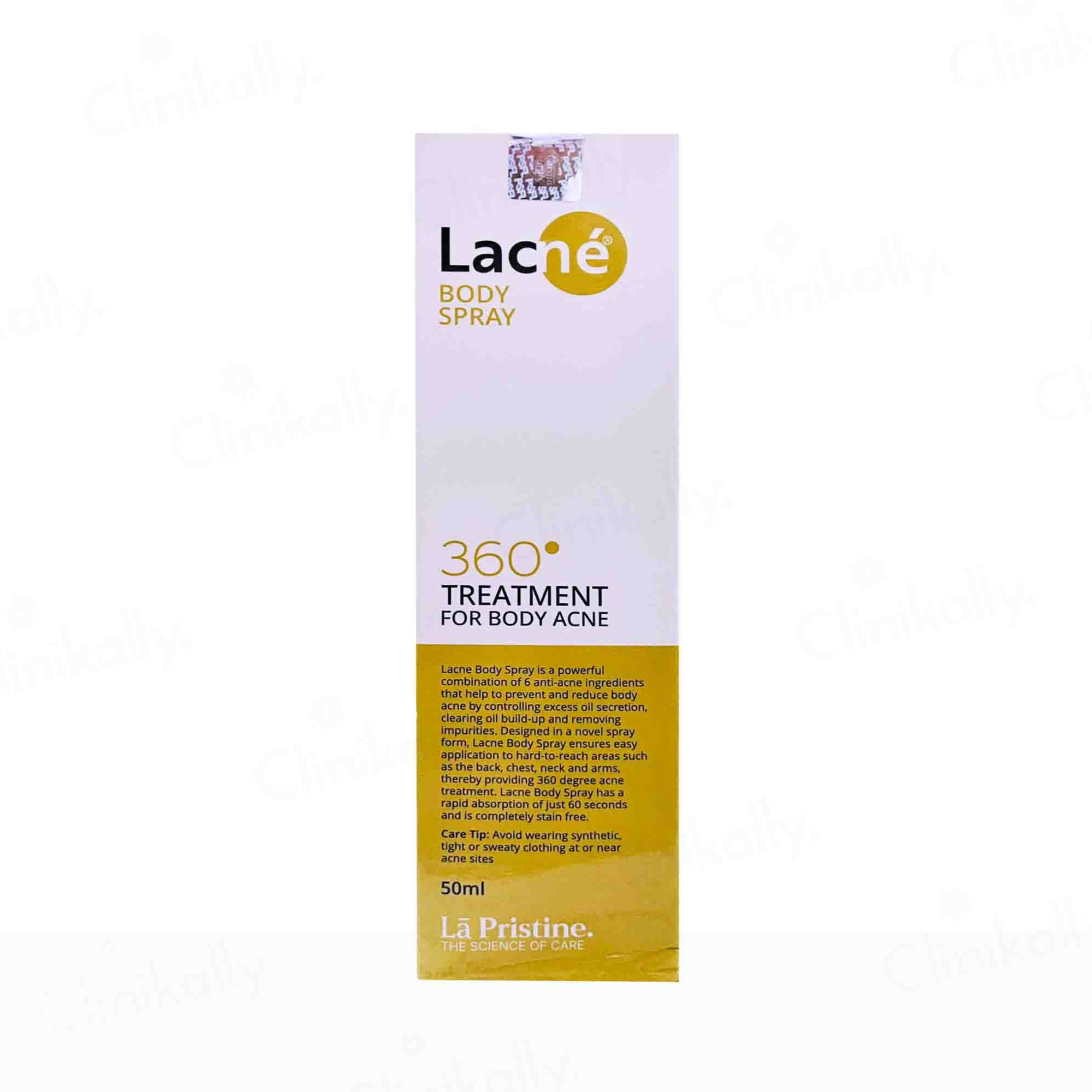 Lacne 360 Acne Treatment is a body spray designed to help reduce and prevent the development of acne and pimples on the body. It comes in the form of a body spray that is applied to hard-to-reach areas such as the back, chest, neck, and arms. The spray contains a powerful blend of substances that help control excess oil secretion, clear oil build-up, and remove impurities that contribute to the formation of acne. The spray is a novel approach to managing body acne and supports an acne-free body.