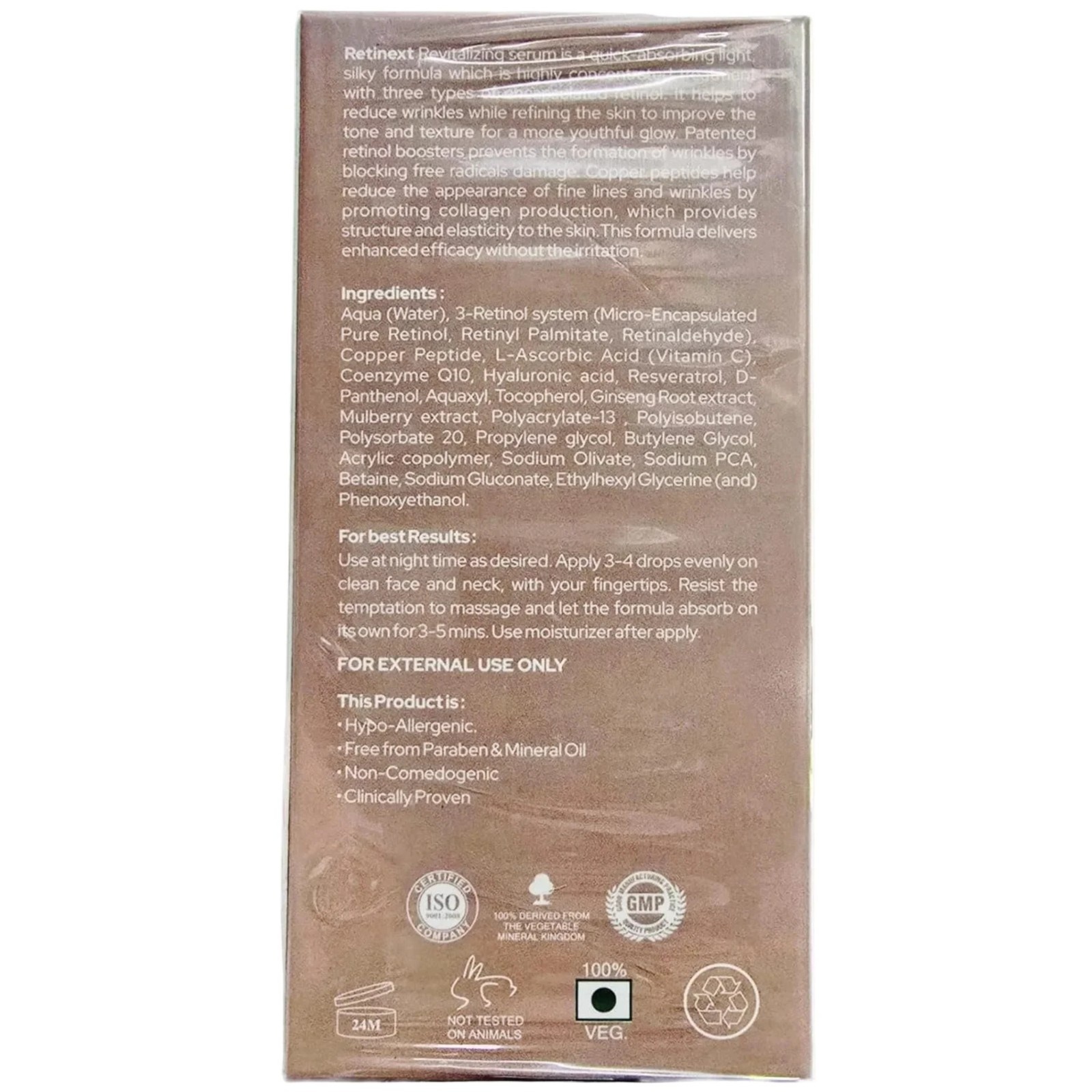 Retinext Revitalizing Serum is a lightweight anti-aging serum formulated with a 3-Retinol System in an encapsulated delivery to help target fine lines, wrinkles, uneven skin texture, and age spots while reducing the irritation often associated with retinoids. It aims to refine and smooth the skin for a youthful, radiant look.