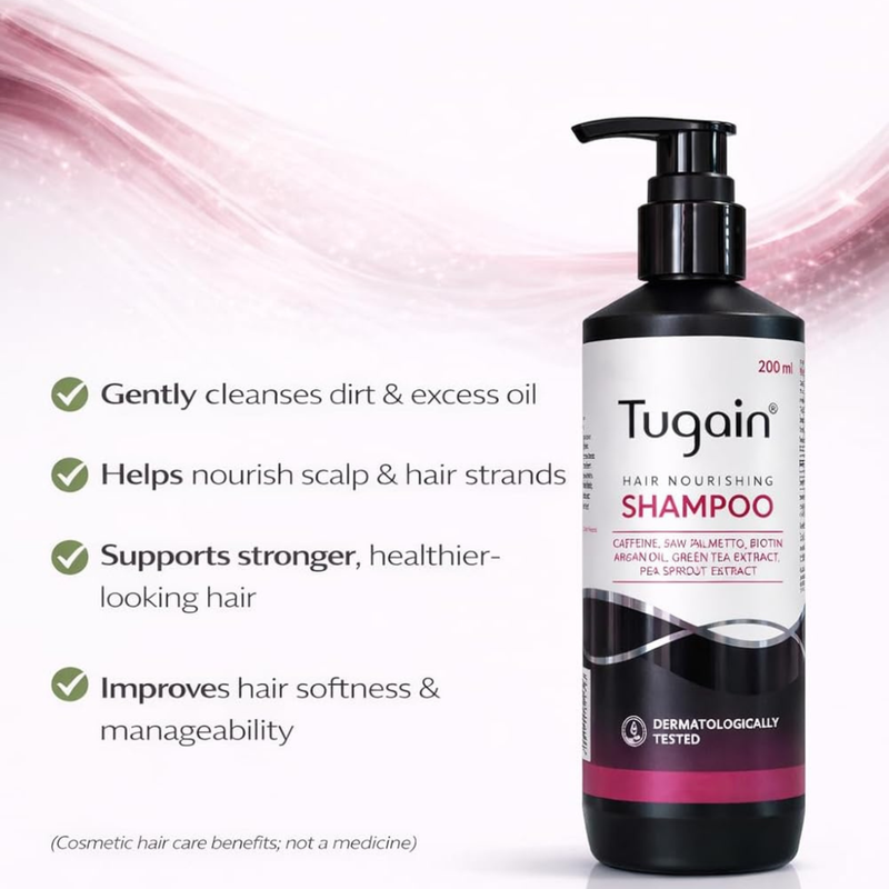 Scientifique Tugain Hair Nourishing Shampoo is a dermatologist-tested daily care shampoo formulated to gently cleanse the scalp while nourishing hair roots and strands. Enriched with Caffeine, Saw Palmetto, and Biotin, it helps support stronger-looking hair and improved scalp health with regular use. The formula is further powered with Argan Oil and Green Tea Extract, which help moisturize hair, enhance softness, and protect against environmental stressors. Pea Sprout Extract nourishes the scalp and supports overall hair vitality. Its mild cleansing action removes excess oil, dirt, and buildup without over-drying, leaving hair feeling clean, refreshed, and manageable. Suitable for men and women, this shampoo works well for dull, weak, or stressed hair and is ideal for regular use.